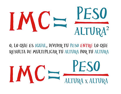 Se considera que el IMC es una medida para medir el riesgo de enfermar mucho mejor que tu peso actual. Mientras más alto sea su IMC mayor será su riesgo de presentar enfermedades relacionadas con el peso, tales como diabetes tipo 2 o enfermedad del corazón. Al hacer un análisis sobre la relación del IMC con la mortalidad, todo parece indicar que el promedio óptimo teórico par la población es de 21 a 22 de IMC, observándose que valores por encima de estos, incrementan ya el riesgo de enfermar. El riesgo de mortalidad comienza a incrementarse a partir de un IMC mayor a 25. El IMC se calcula a través de una fórmula matemática muy sencilla: tu peso en kilogramos sobre tu altura en metros al cuadrado. IMC = Peso en Kg/(Altura en Mts)2 Por ejemplo, si pesas 65 kilos y mides 1,63 metros, tu IMC se calcula de esta manera: IMC = Peso en Kg = 65 kg = 65 kg = (Altura en Mts)² (1,63 mts)² 1,63 mts x 1,63 mts = 65 kg = 24,4646 = 24,5 PESO NORMAL 2,6569 La cifra que da al final de esa ecuación será la clasificación de tu cuerpo según las siguientes categorías: Menos de 18,5: Peso bajo. De 20 a 24,9: Peso normal. De 25 a 29,9: Pre obesidad De 30 a 34,9: Obesidad clase 1 (Leve). De 35 a 39,9: Obesidad clase 2 (Moderada). De 40 en adelante: Obesidad clase 3 (Grave). ¿El IMC tiene Desventajas? Sí, muchas, si no es aplicada correctamente: El IMC no puede aplicarse en los extremos de la vida (niños y ancianos), tampoco en personas de musculatura muy desarrollada (por ejemplo, físico-culturistas), ni en personas que hayan sufrido enfermedades que consumen la grasa y la masa muscular. El IMC indica la condición de peso, no diferencia la masa grasa de la masa muscular. Si calculamos el IMC del tipo de personas que nombramos anteriormente, los ubicaremos en alguna clasificación equivocada. Fíjate en esto! Dos personas pueden tener el mismo IMC con diferente porcentaje de grasa corporal. Un fisicoculturista, con un gran desarrollo de masa muscular y un bajo porcentaje de grasa corporal, puede tener el mismo IMC que una persona obesa, ya que sólo se toman en consideración para el cálculo, el peso y la estatura:
